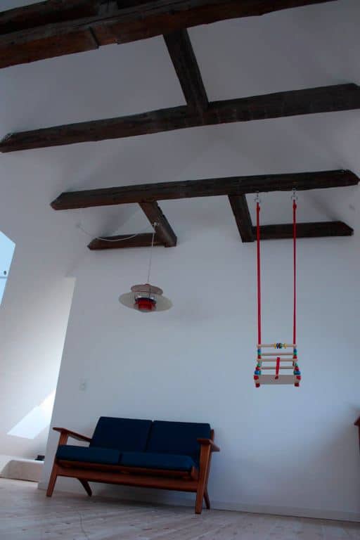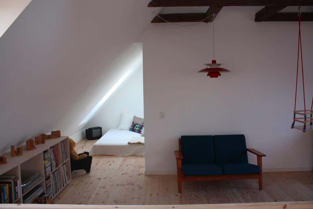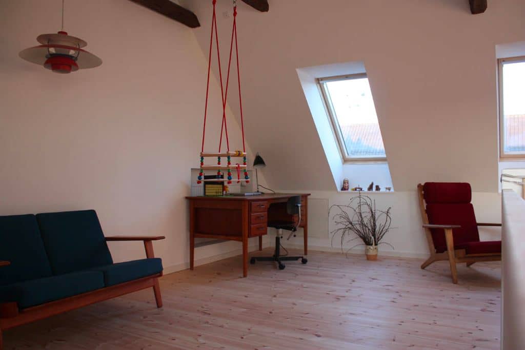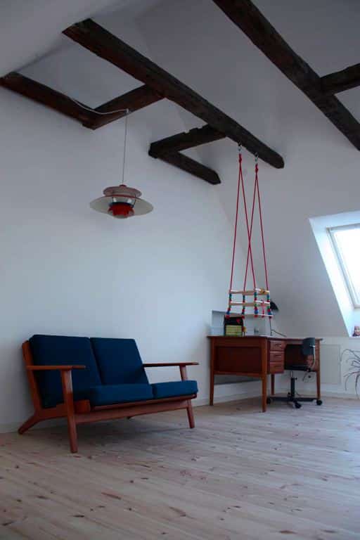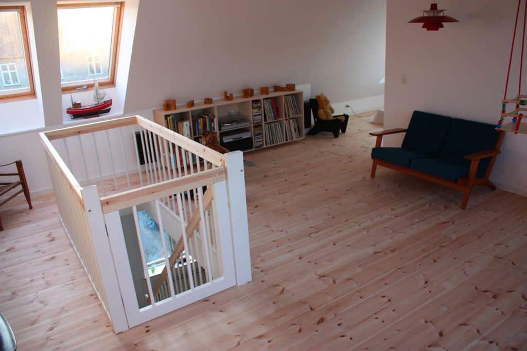 På Sjællandsgade i København stod Sydfyns Byggefirma for at inddrage tørreloftet over lejligheden. Loftrummet gav nogle praktiske, lækre kvadratmeter med højt til loftet, synlige loftsbjælker og fyrretræsgulv, så lejligheden nu kunne rumme hele familien. Veluxvinduerne giver den nye boligetage ekstra lysindfald og gør rummet endnu mere lyst og indbydende.